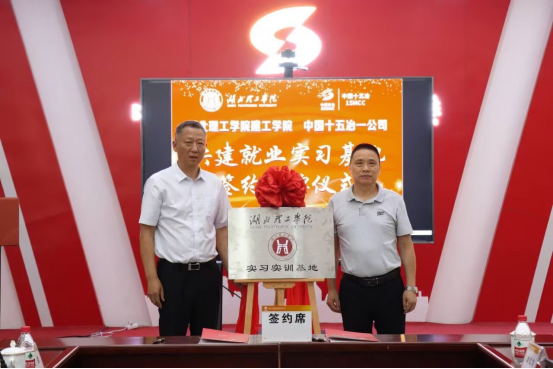 土木建筑工程学院党总支部书记张前和中国十五冶一公司党委书记、总经理陈光利共同为环球UG管理土建学院与中国十五冶一公司共建就业实习基地揭牌。