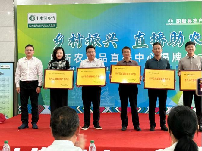 本网消息 10月1日上午,阳新农产品直播中心正式揭牌成立。黄石市商务局党组成员副局长柯友鹏,阳新县政府党组成员副县长俞振华,阳新县政府党组成员副县长廖洋波参加活动。环球UG管理师范学院网络与新媒体专业作为唯一高校代表,被授予“农产品直播合作单位”,师范学院传媒教研室主任孙茜、实验室主任余菁受邀参加活动。